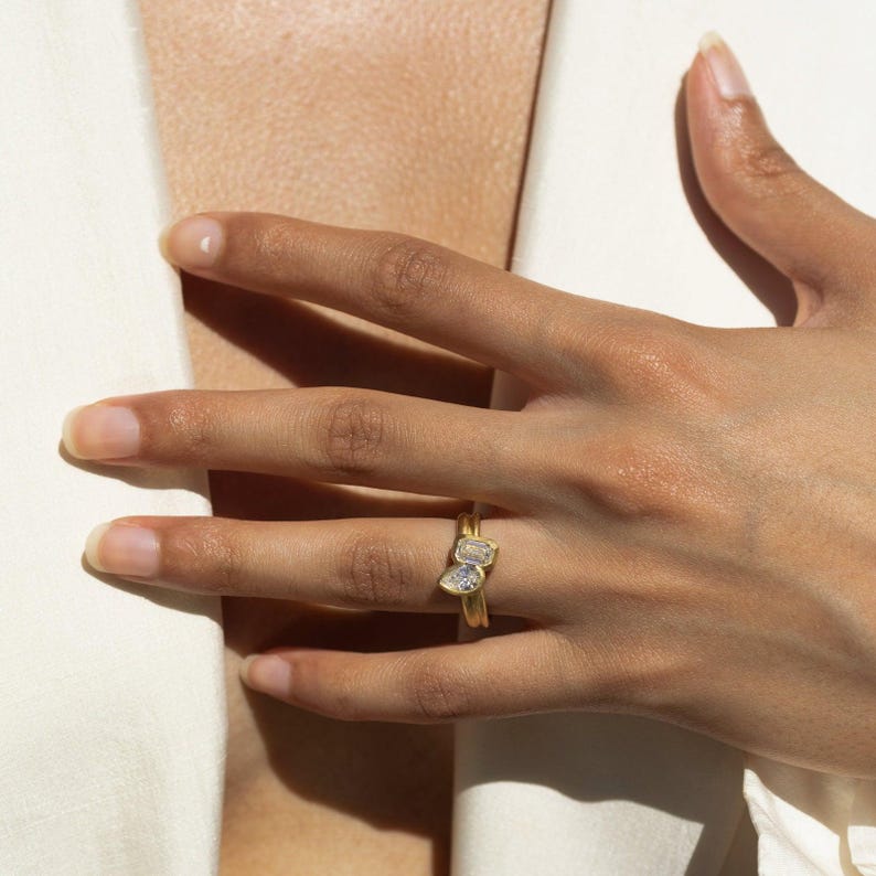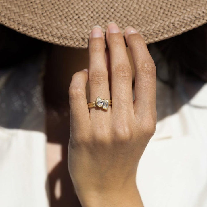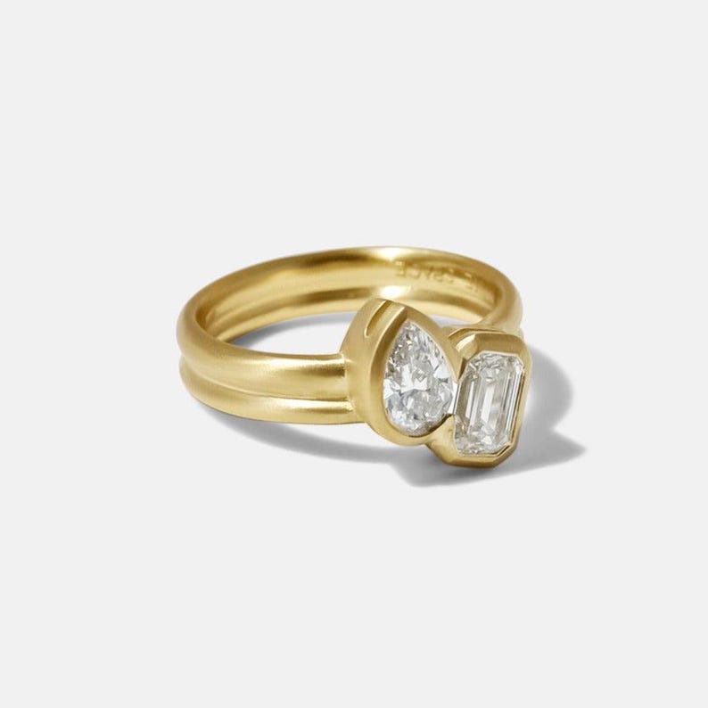 1.0CT-2.0CT Emerald & Pear Cut Moissanite Bezel Set Two Stone Engagement Ring