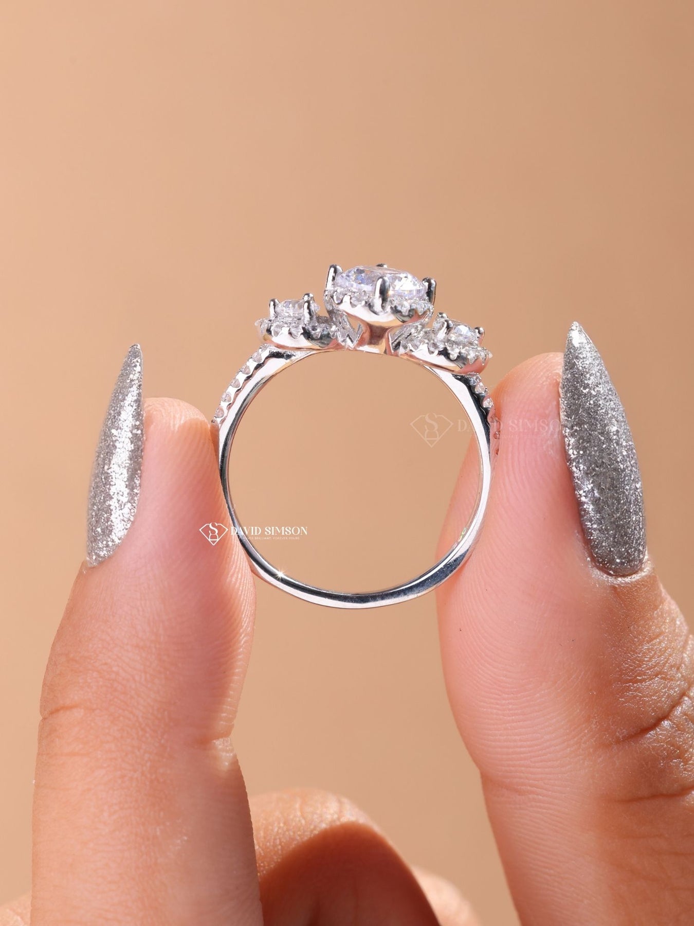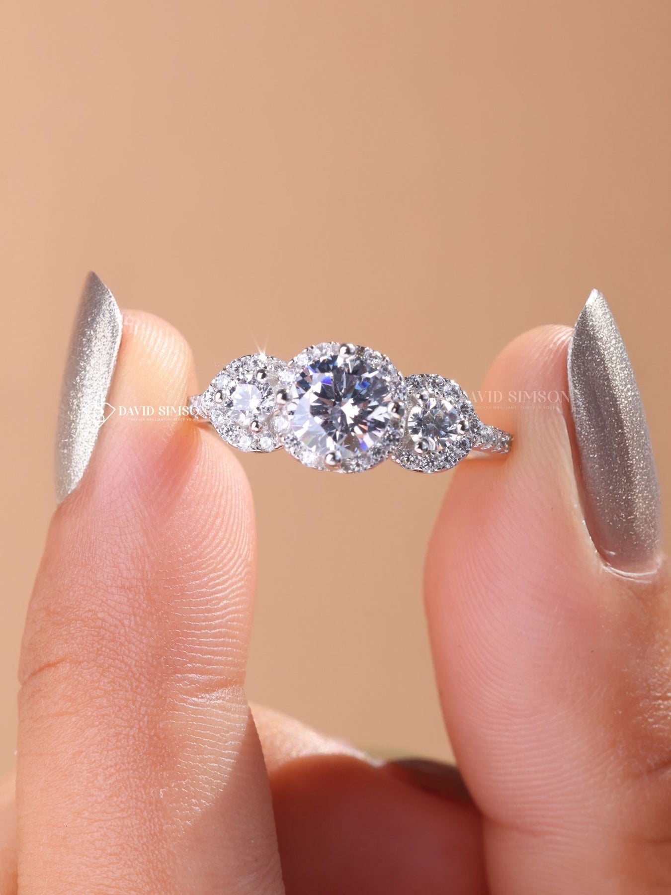 1.0CT-2.0CT Round Cut Moissanite Halo Diamond Three Stone Engagement Ring