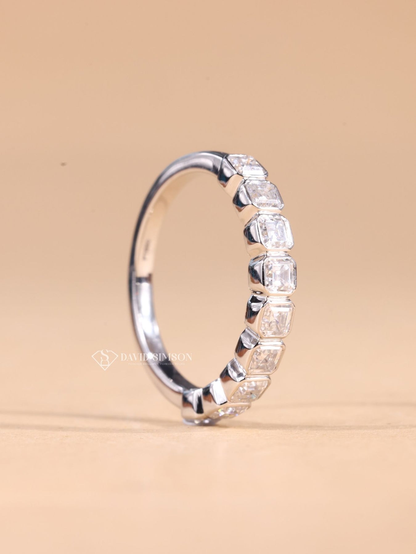 This exquisite half eternity wedding band showcases bezel-set Asscher cut moissanite diamonds, offering a modern twist on classic elegance. The secure bezel setting highlights each stone’s unique step-cut facets, delivering exceptional sparkle and durability. Perfect for celebrating everlasting love, this band combines sophistication with timeless style for everyday wear.