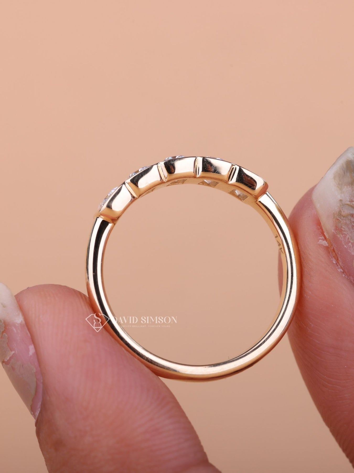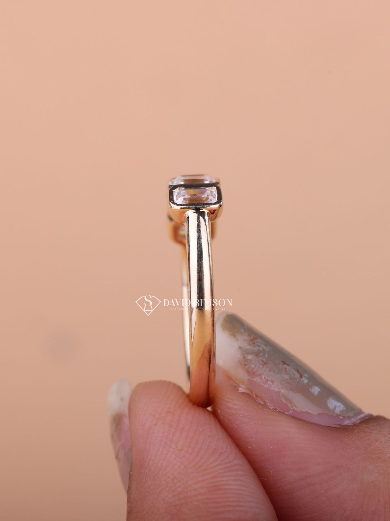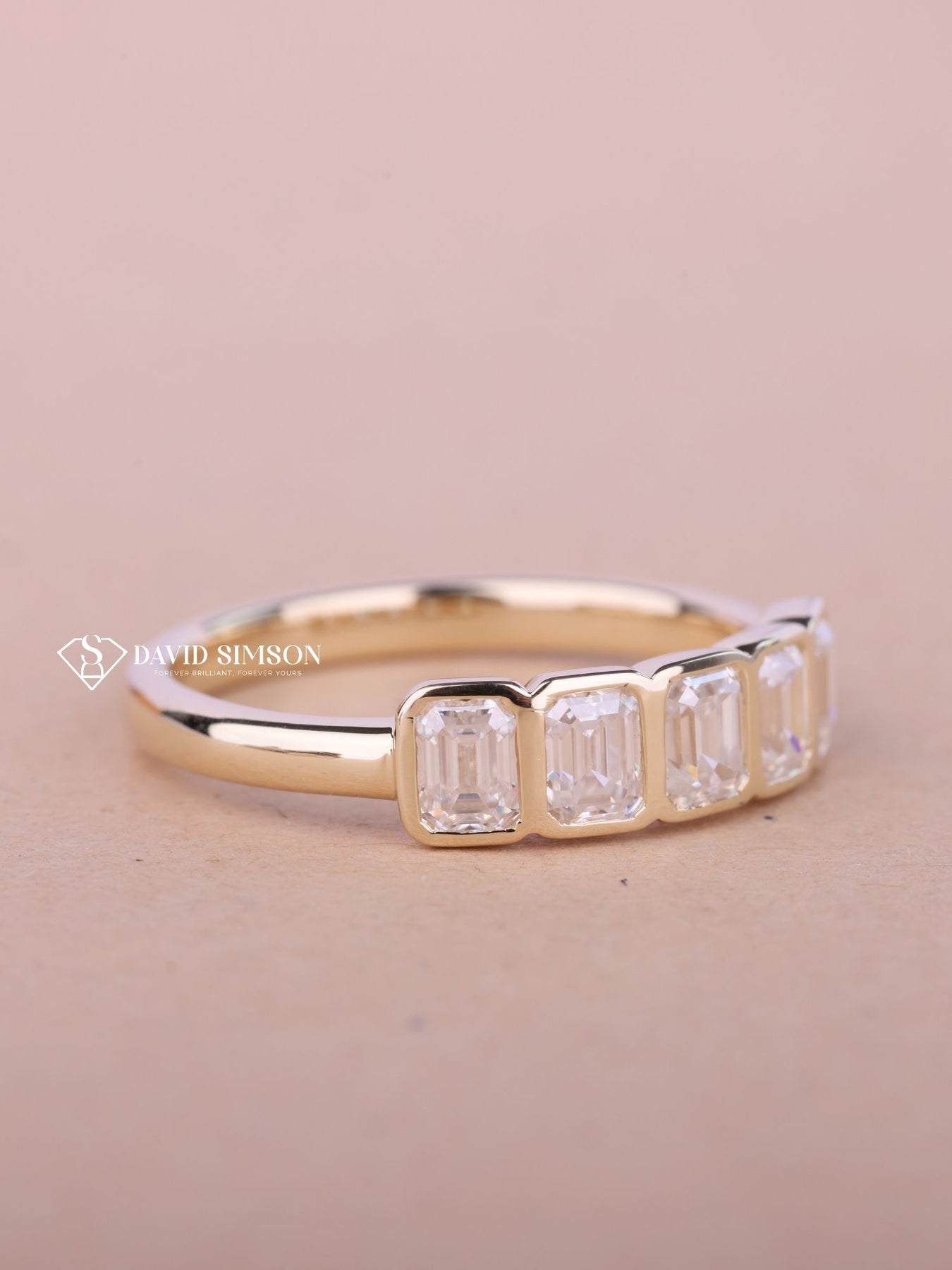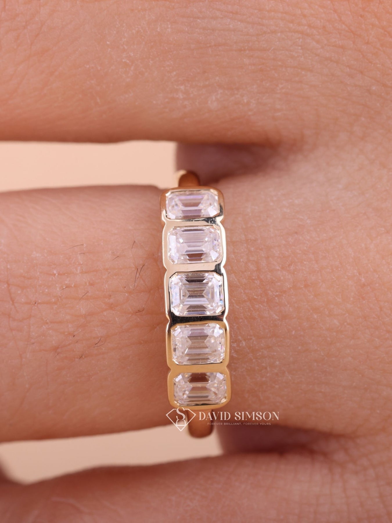 This bezel set emerald cut moissanite diamond five stone wedding band in gold features refined diamond rings designs with an engagement ring simple yet sophisticated style. Perfect for an engagement ring stack or as a stunning standalone, it suits diamond rings for women seeking elegant diamond rings engagement and versatile diamond rings stack options.