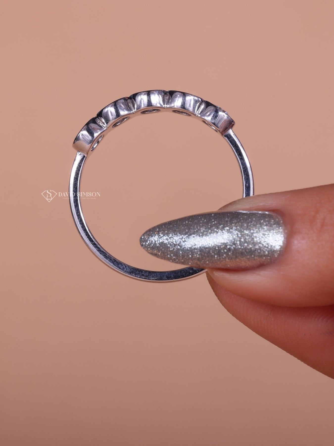 This bezel set round cut moissanite diamond eternity band pairs beautifully with any engagement ring simple or engagement ring gold. Ideal for an engagement ring stack, it features classic diamond rings designs perfect for diamond rings for women seeking elegant diamond rings engagement and versatile diamond rings stack options.