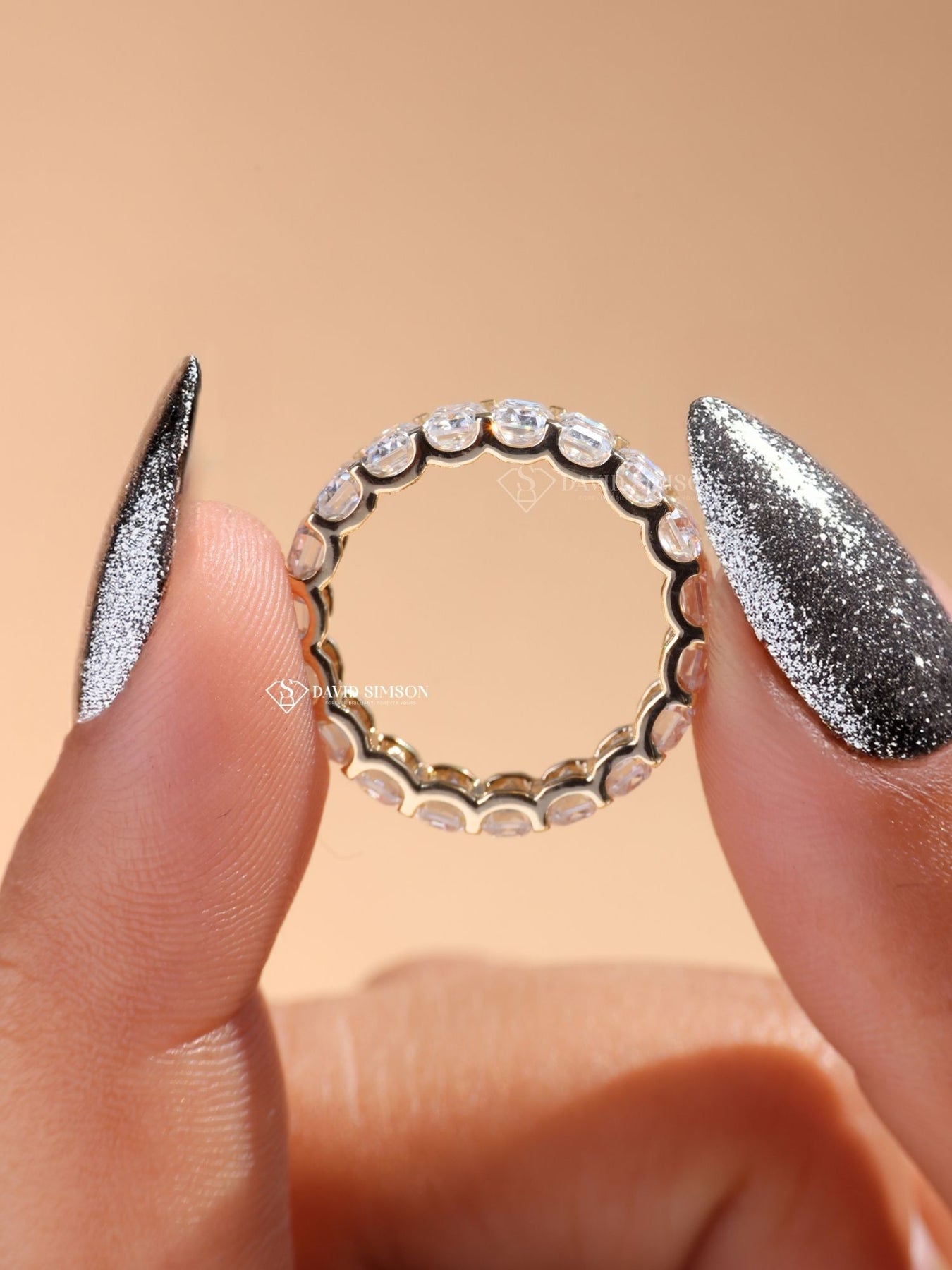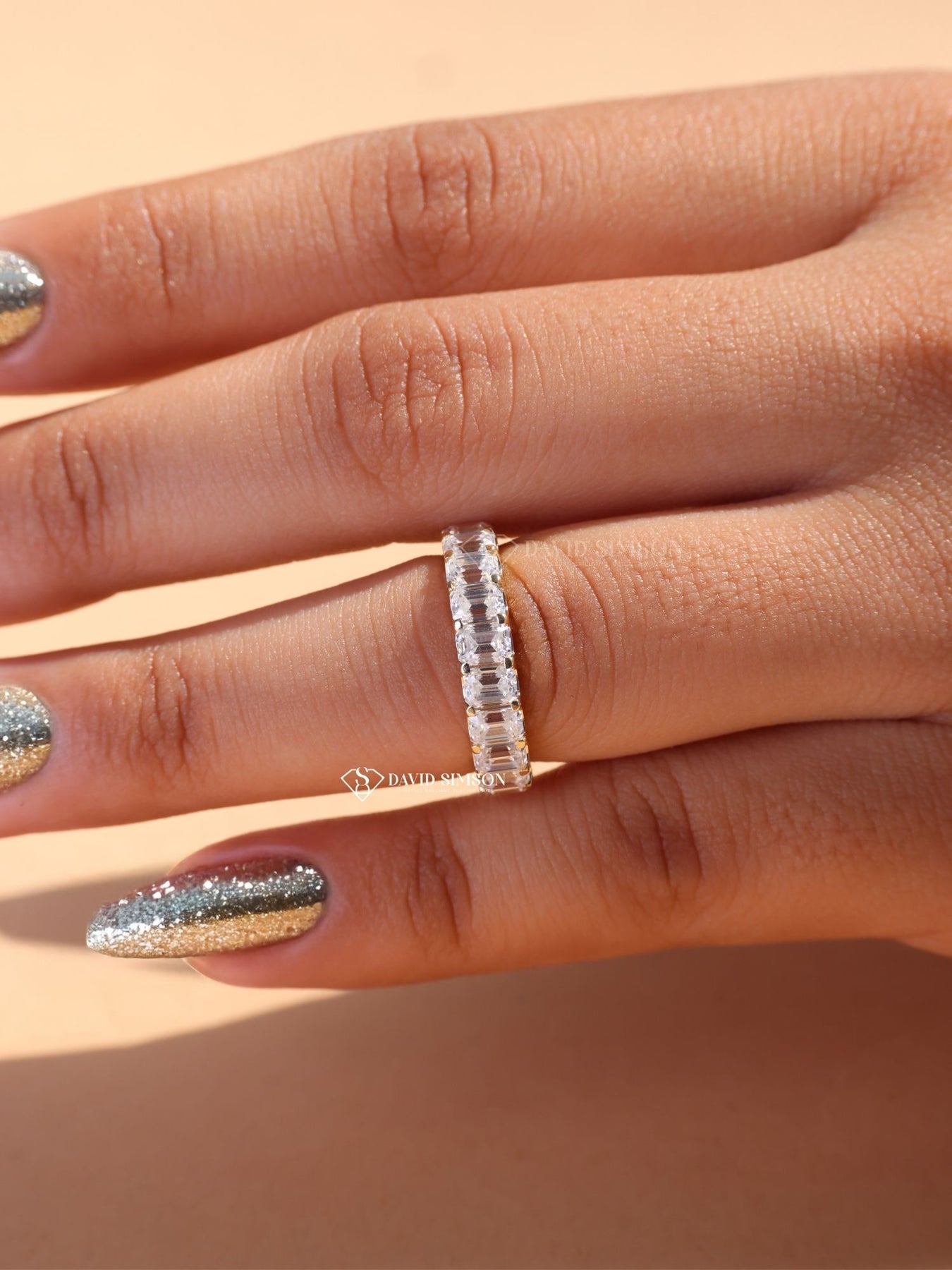 This Emerald Cut Moissanite Diamond Full Eternity Wedding Band offers timeless elegance and continuous sparkle, perfect as a diamond band for women or part of a diamond band stack. Its exquisite diamond band designs make it a stunning choice for diamond band engagement and special occasions.