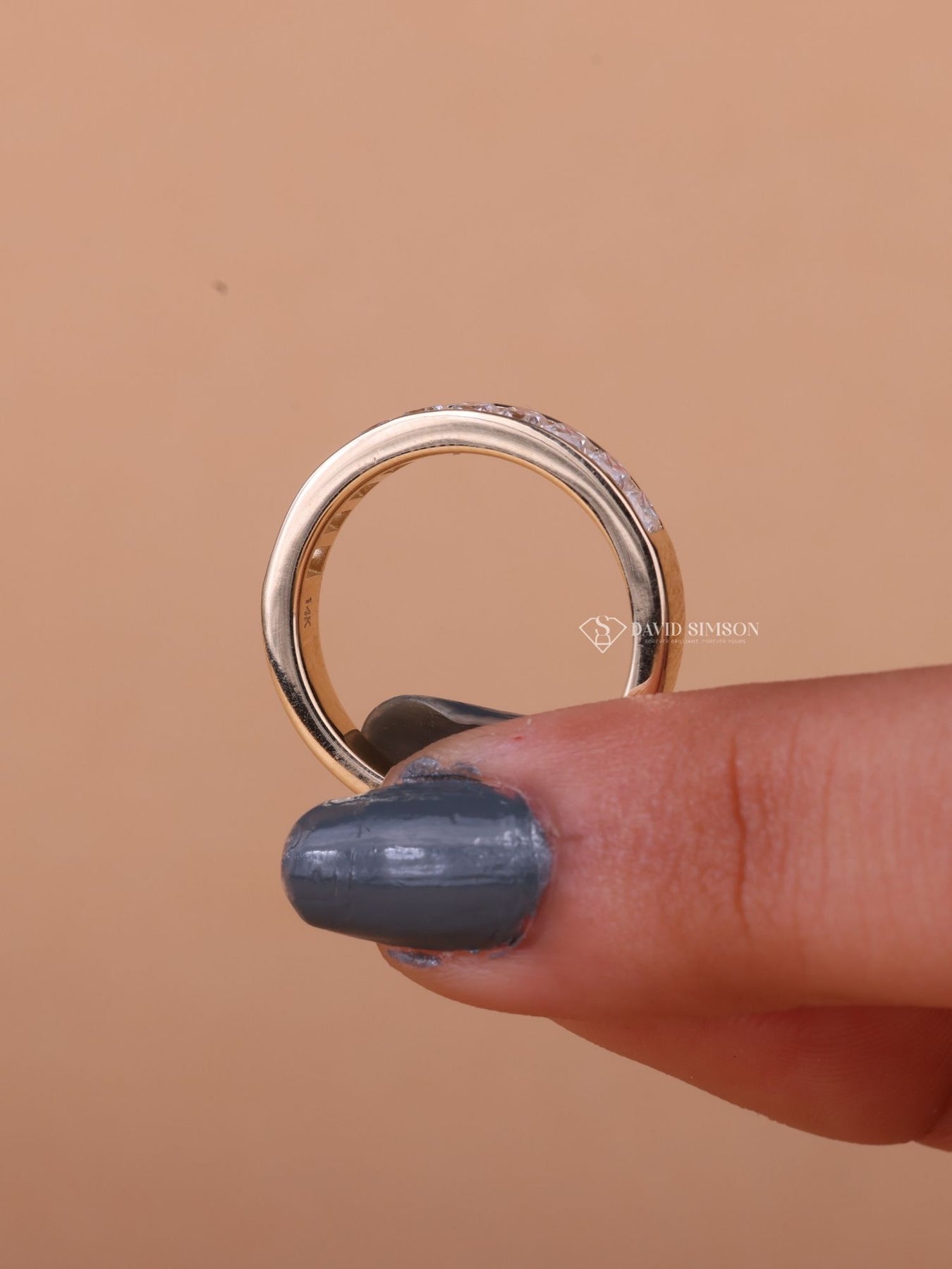 Celebrate forever with this princess cut Moissanite diamond half eternity flush set wedding band. Featuring brilliant princess cut stones seamlessly set halfway around the band, it offers sleek sparkle and comfort. Ethically crafted for lasting beauty, this elegant ring perfectly complements your engagement ring and symbolizes endless love.