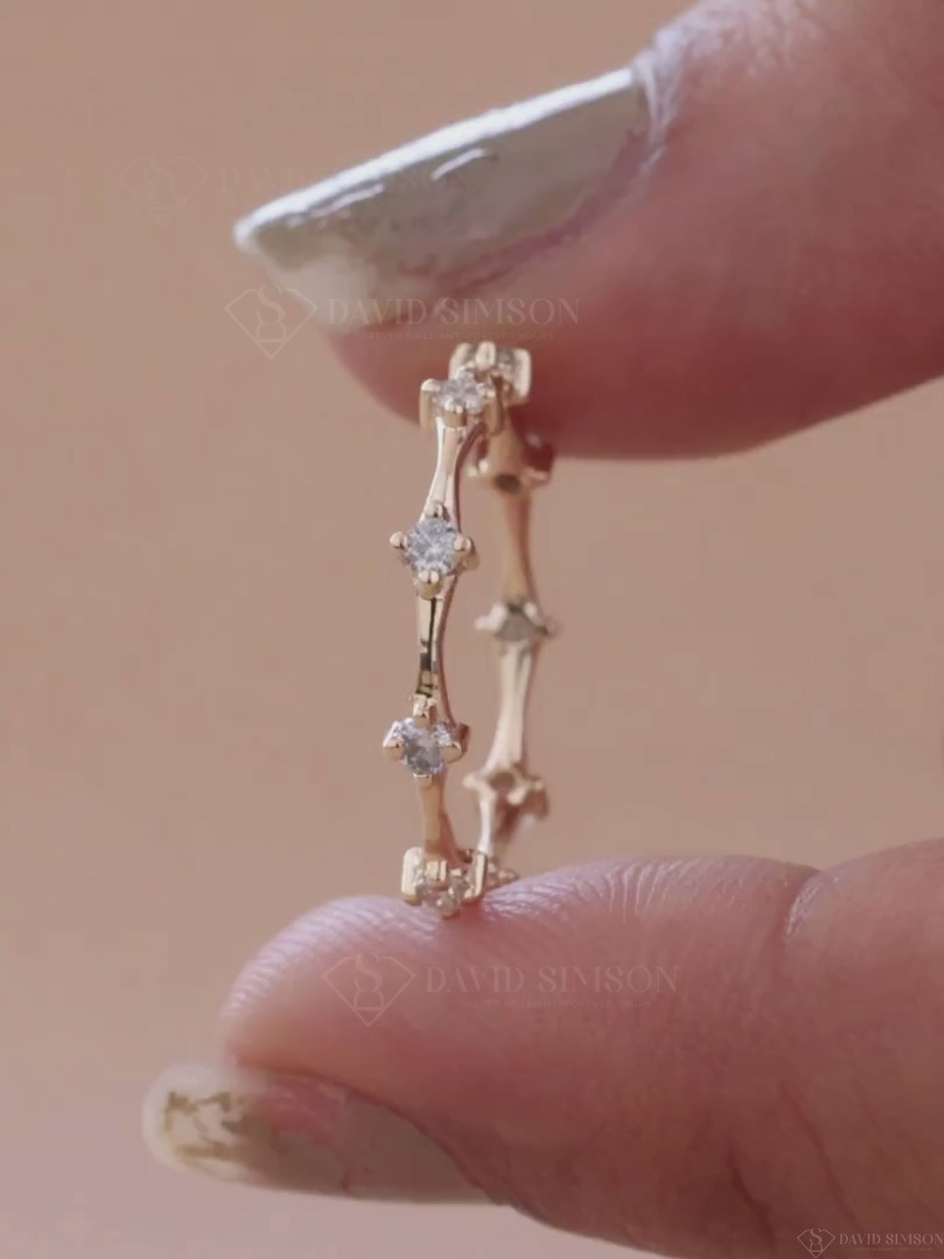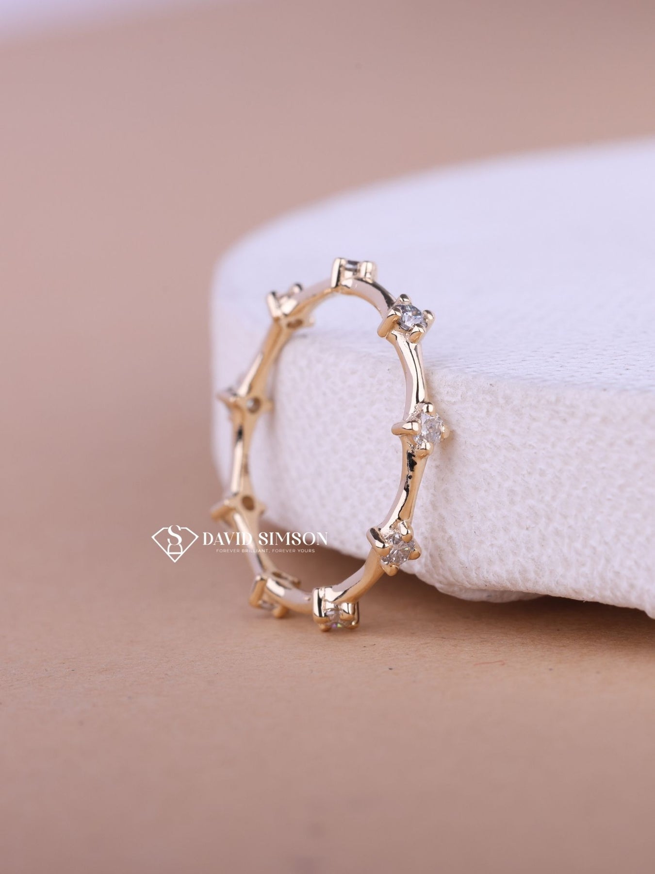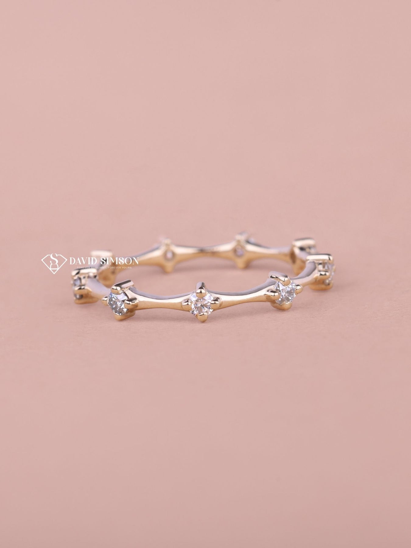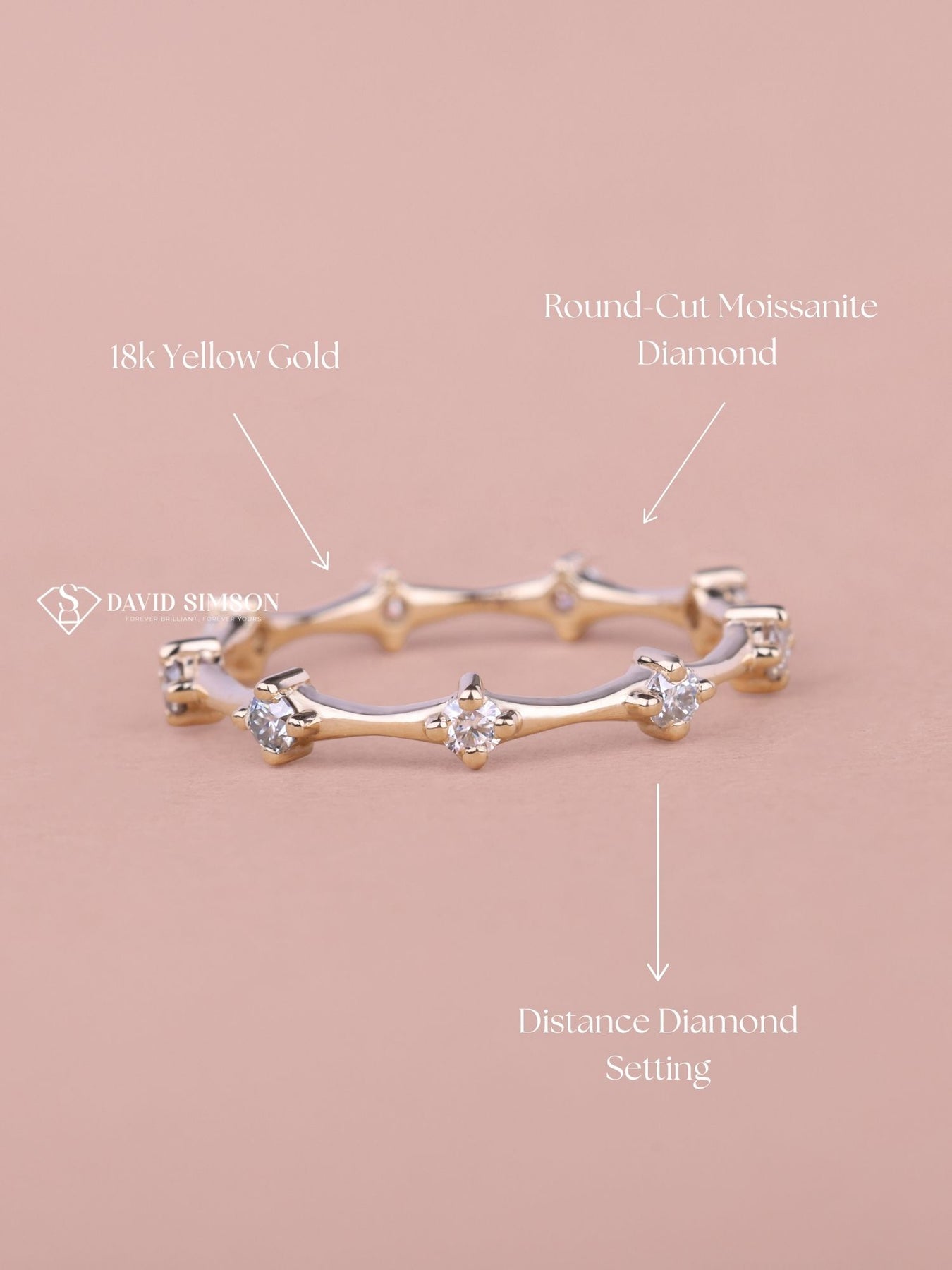 This round cut moissanite distance diamond wedding band in gold offers elegant diamond rings designs with an engagement ring simple and modern feel. Ideal for pairing in an engagement ring stack or as a graceful standalone, it is perfect for diamond rings for women who appreciate classic diamond rings engagement and versatile diamond rings stack styles.