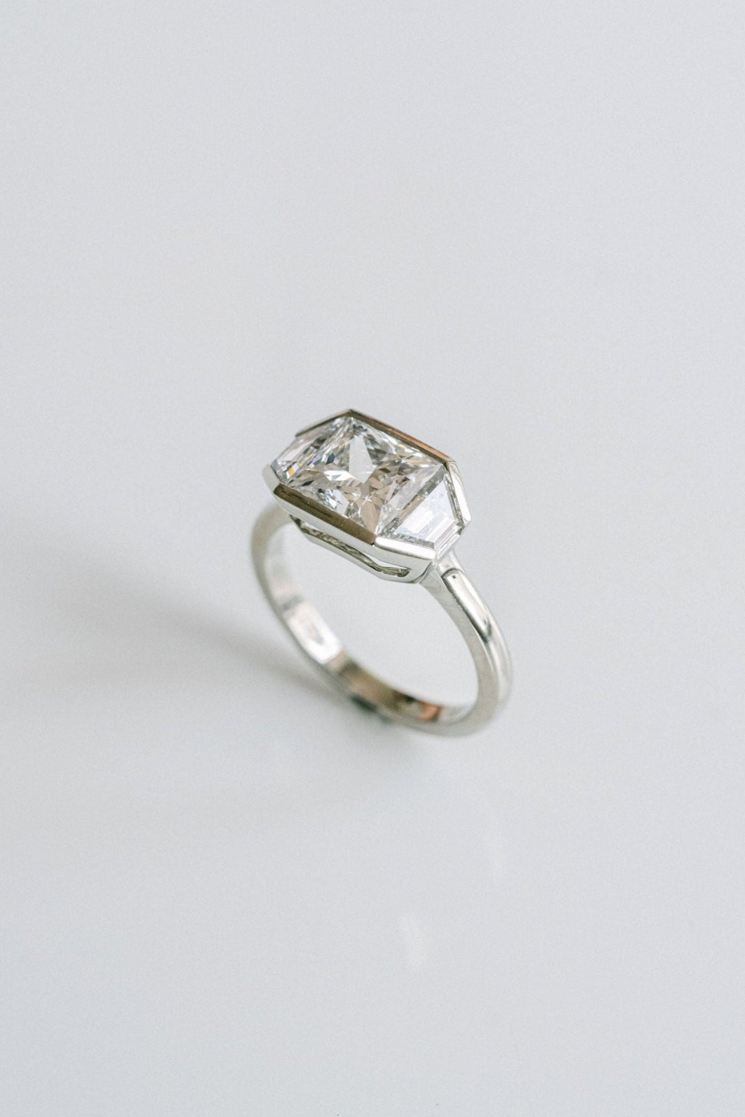 ✥ Celebrate modern love with this 1.50CT-2.50CT Bezel Set Princess Cut Diamond Three Stone Engagement Ring. Featuring a bold princess cut center stone flanked by two sparkling side diamonds, each securely nestled in sleek bezel settings, this ring blends contemporary elegance with timeless symbolism. The three stones represent your past, present, and future, making it the perfect engagement ring for a love story built to last.